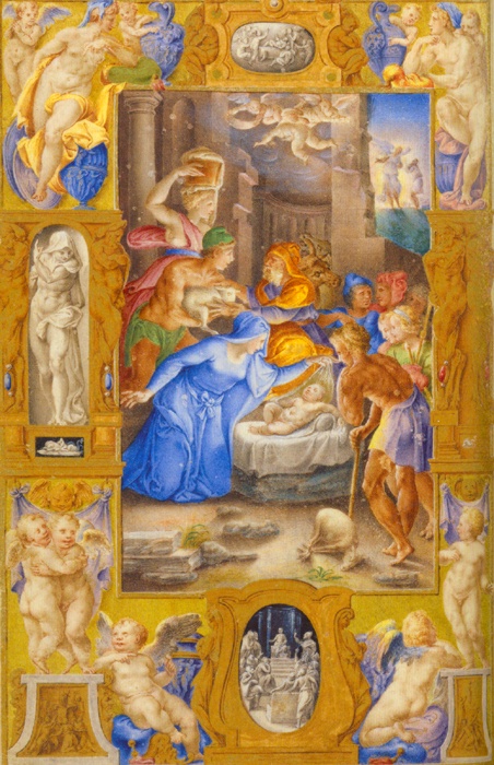 Rome, 1537-1546 Les folios 27 v. et 28 r. évoquent deux scènes de l’Ancien et du Nouveau Testament. Adam et Ève tenant le fruit défendu sont mis en regard de l’Enfant adoré des rois et de la Vierge. Il s’agit ici de l’allégorie du mal symbolisé par le serpent au visage féminin et de Marie qui rachètera la faute originelle. L’œil demeure ébloui par la virtuosité des illustrations et par les bordures suggérant des cadres architecturaux remplis de nus à la Michel-Ange. Dans les camées en grisaille des bordures, on reconnaît à gauche, l’Annonciation aux bergers et Jésus enseignant au Temple. |