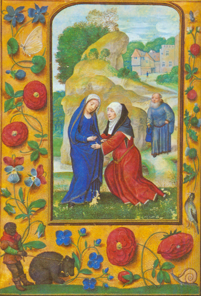 Das Blumen-StudenbuchGand ou Bruges, vers 1520-1525 Folio 69 v. : La Visitation, tirée des Heures de la Vierge, démontre cette originalité. L’illusion des fleurs qui, règle générale, semblent posées sur le parchemin est ici troublée par les couleurs fantaisistes et le voisinage de l’ours minuscule mordant une véronique. Le paysage d’arrière-plan montre un modèle traditionnel transformé: la maison est repoussée au loin, un chemin serpente en montant derrière Joseph et un massif rocheux couvert d’une forêt domine cet arrière-plan. Ainsi s’annonce ce qui deviendra un trait spécifique au maître, soit le développement de superbes paysages, miniatures en soi. Simon Bening est certainement, de tous les enlumineurs, celui qui, dans son travail, s’approche le plus de la peinture de chevalet. Facsimilé à l’identique: Lucerne, Faksimile Verlag, 1991. Ex. 136/980 |