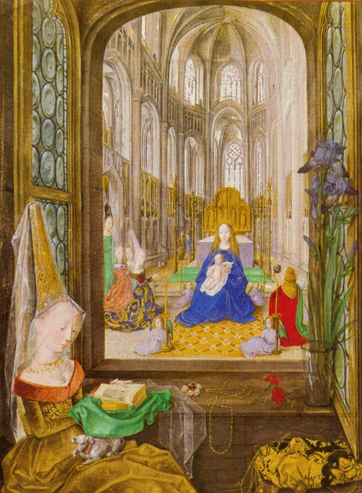Gand ou Bruges, 1470-1480 Deux fenêtres particulières ont fait la célébrité du manuscrit. Le folio 14 r. est une des plus anciennes et subtiles applications de bordure en trompe-l'œil: le cadre est avancé par rapport au plan de l'image et donne un effet de profondeur remarquable, comme si le spectateur regardait le motif principal par la fenêtre d’un petit oratoire. Le premier plan montre Marie de Bourgogne ou sa belle-mère somptueusement vêtue et plongée dans la lecture de son livre d'heures. Le rebord de la fenêtre laisse voir un voile, un bijou serti de pierres précieuses, des parures, des œillets rouges et un vase chatoyant d'où s'élancent deux iris bleus. Les battants de la fenêtre sont ouverts sur le chœur d'une cathédrale gothique où trônent la Madone et l'Enfant. Facsimilé: Graz, ADEVA, 1969 |