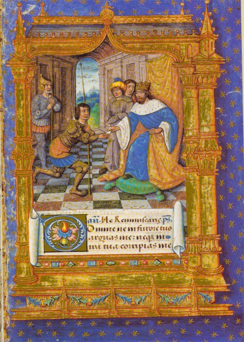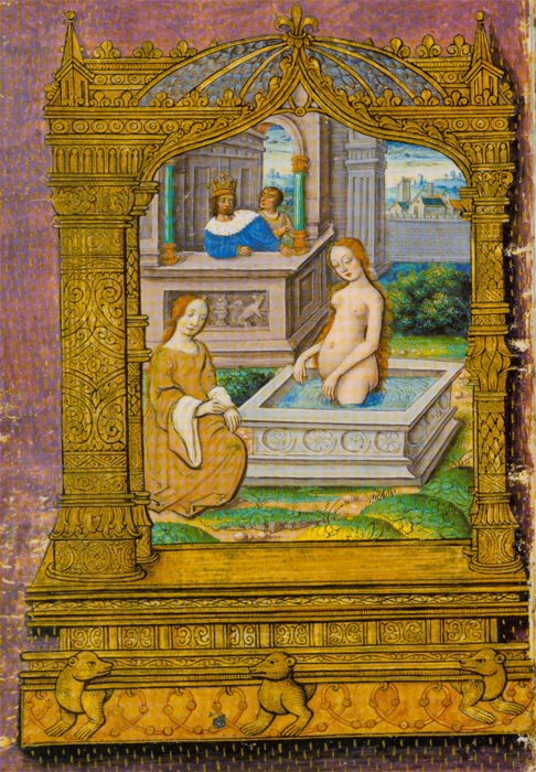 Stundenbuch für RouenRouen ou Paris, 1510 (?) Folio 67 v. : Sous une arcade aux colonnes de malachite, le roi David, sous le regard désapprobateur d’un serviteur, contemple Bethsabée au bain. Elle a les yeux baissés vers sa suivante. On retrouve maintes représentations très proches de cette scène dont deux folios du Maître Flavius Josèphe, l’un à la Pierpont Morgan Library de New York et l’autre à la Bibliothèque Universitaire de Gand. |